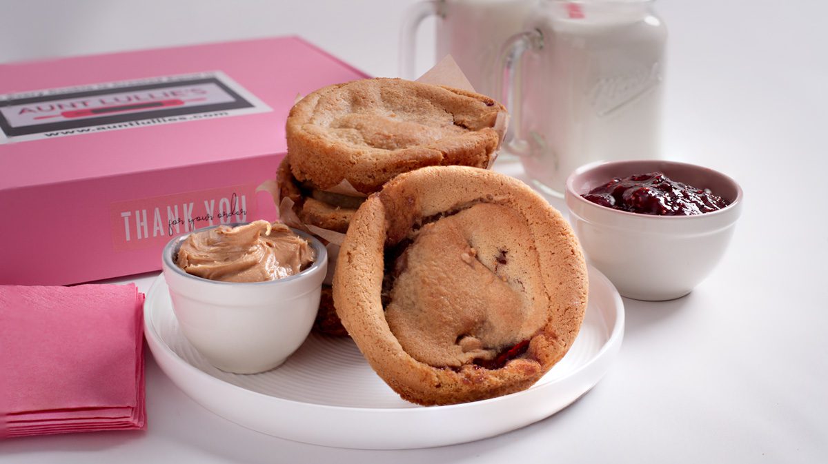 Peanut Butter Chips and Four Berry Jelly – This cookie is one of Aunt Lullie’s most popular. We bake heaping mounds of smooth, creamy peanut butter and four-berry into our classic cookie dough which has been loaded with peanut butter chips. You will not be able to resist this true American classic.